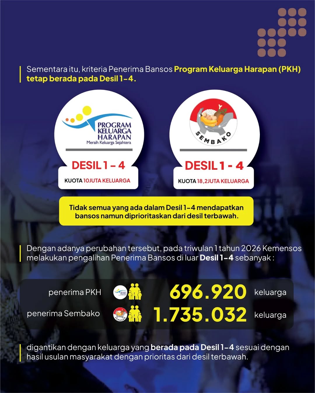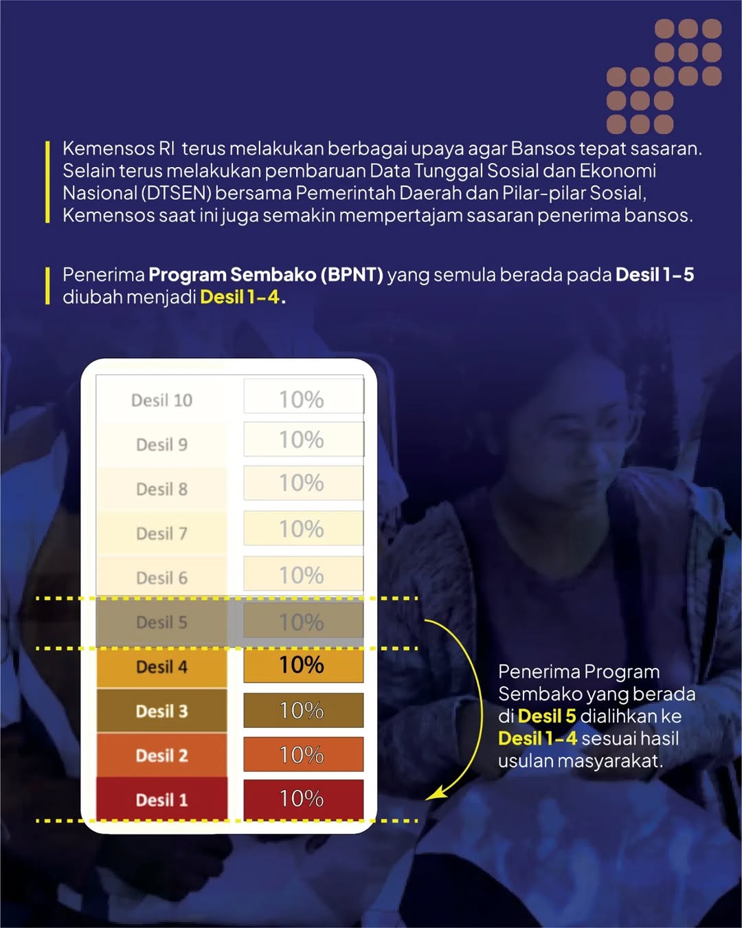 Dalam upaya mempertajam sasaran penerima bansos, Kemensos RI telah melakukan perubahan pada kriteria penerima Program Sembako (BPNT). Sebelumnya, penerima program ini mencakup desil 1 hingga desil 5. Namun, berdasarkan usulan dari masyarakat, penerima Program Sembako yang semula berada di Desil 5 kini dialihkan ke Desil 1-4. Perubahan ini berarti fokus penyaluran bantuan akan lebih ditekankan pada kelompok masyarakat yang berada di desil terendah (Desil 1 hingga Desil 4).
