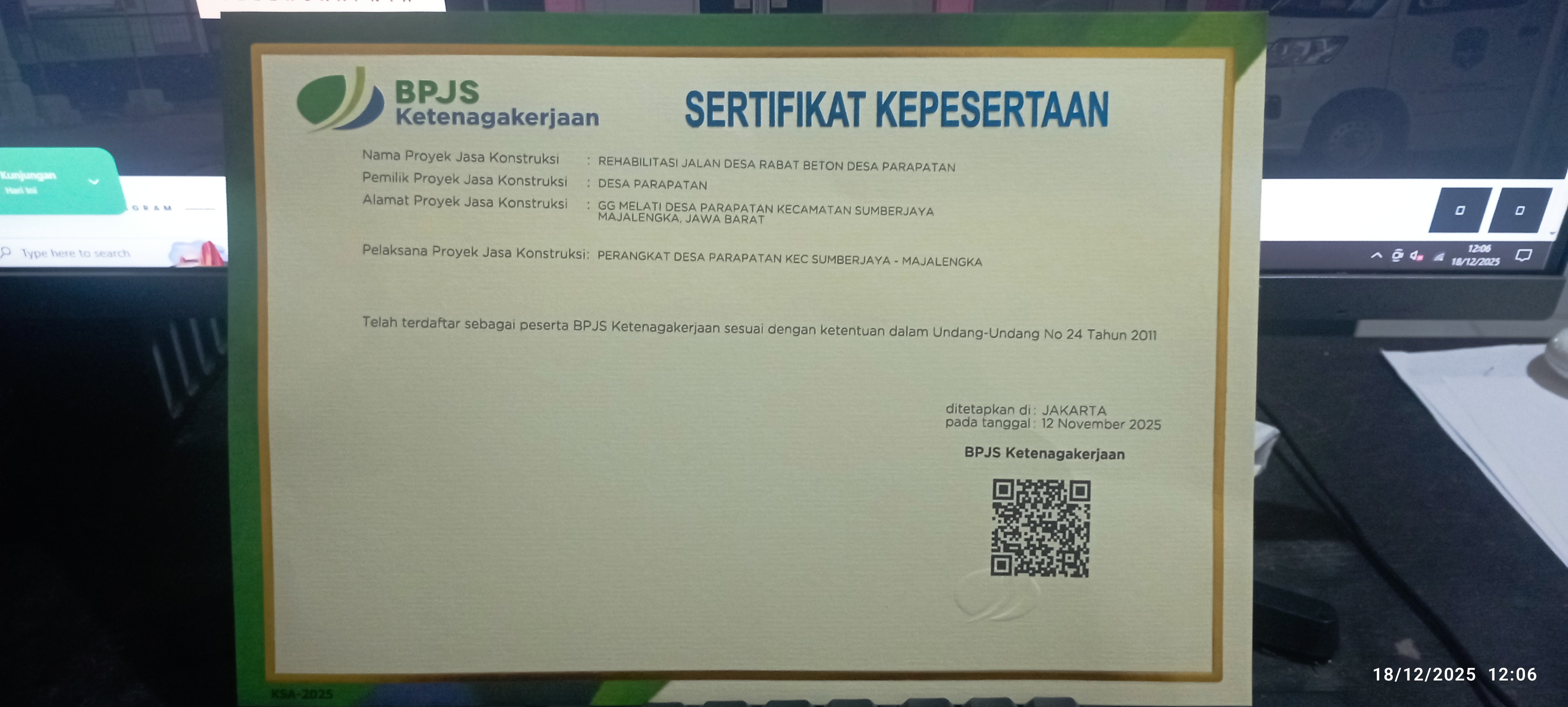Atas dasar terlaksananya kegiatan proyek Jasa Konstriksi Rehabilitasi Jalan Desa Rabat Beton Desa Parapatan, yang berlokasi di Gg. Melati Desa Parapatan Kecamatan Sumberjaya Kabupaten Majalengka. Dimana Pemerintah Desa Parapatan telah dan selalu mengikuti aturan yang berlaku di Negara Kesatuan Republik Indonesia, berdasarkan Undang-Undang No 24 Tahun 2011 dimana setiap pekerja mendapatkan hak perlindungan Jaminan Sosial.
